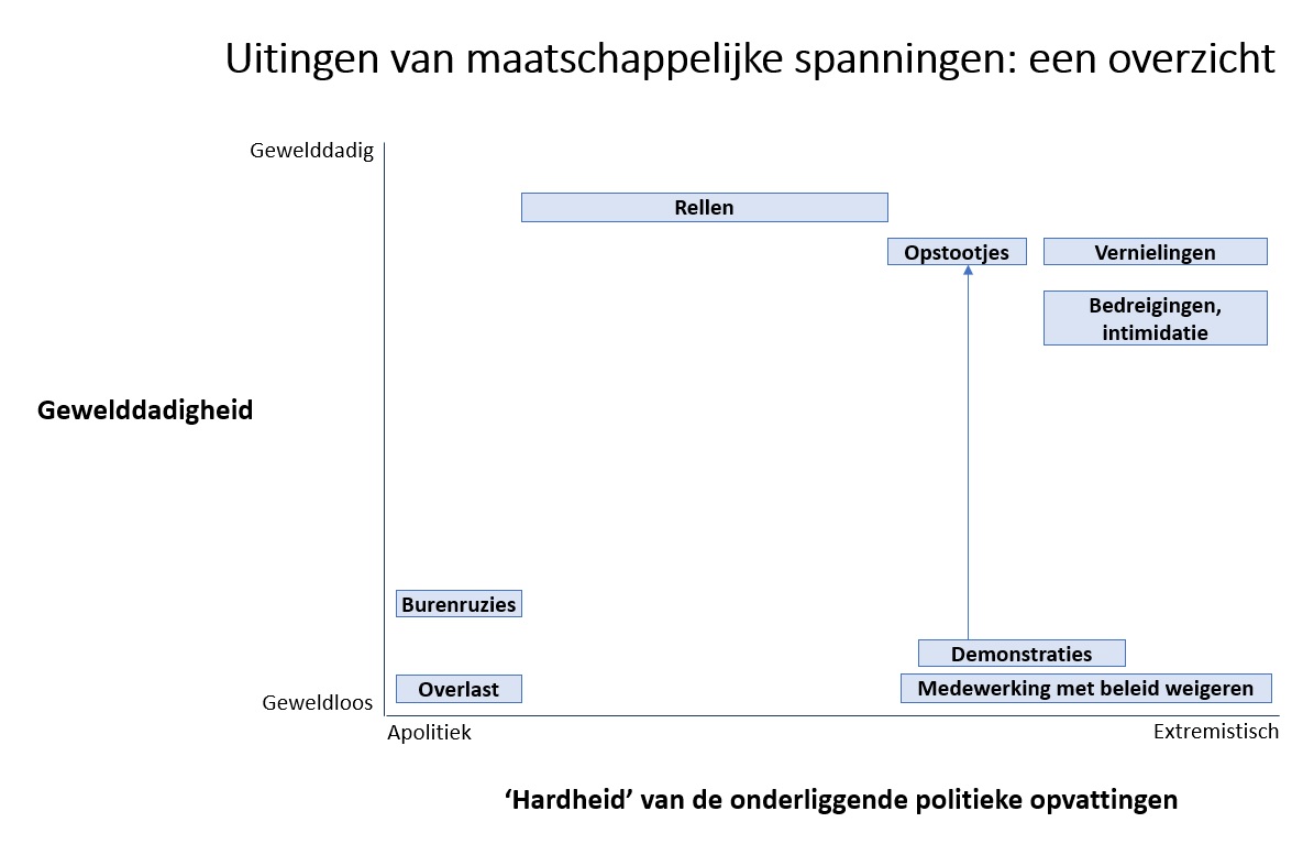 Vervolgens wees Van Dongen erop dat de verschillende uitingen van maatschappelijke spanningen niet alleen van elkaar verschillen in de mate waarin deze voortkomen uit politieke opvattingen over de coronamaatregelen, maar ook in hoe gewelddadig ze zijn. Aldus ontstaat er een stelsel met twee assen (gewelddadigheid en de ‘hardheid’ van de onderliggende politieke opvattingen. Alle combinaties (apolitiek/gewelddadig, zeer politiek/geweldloos) komen voor; oftewel, over het gehele assenstelsel zijn uitingen van maatschappelijke spanningen over (de aanpak van) het coronavirus denkbaar. Deze observatie bracht Van Dongen tot zijn conclusie dat de maatschappelijke spanningen als gevolg van de coronamaatregelen zeer divers zijn en bestuurders op verschillende fronten met verschillende maatregelen moeten komen om de spanningen te de-escaleren.