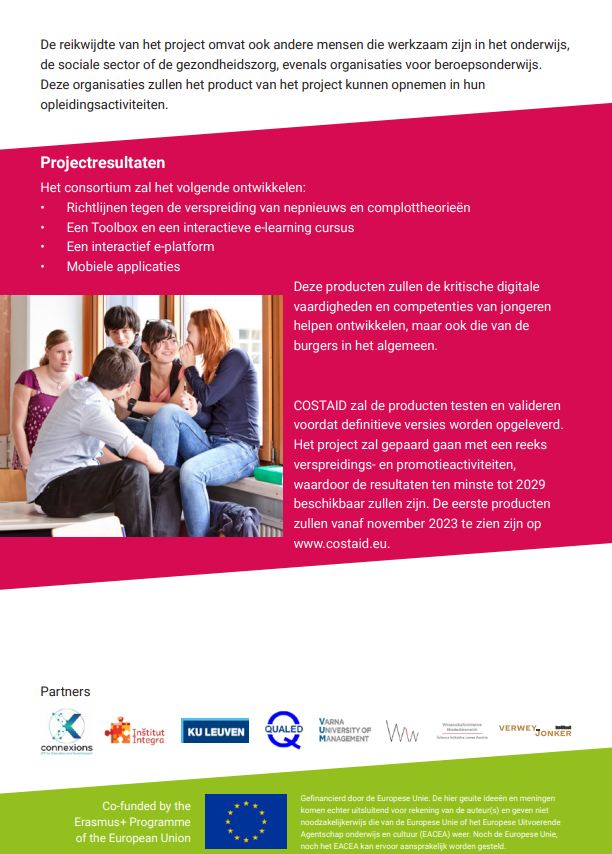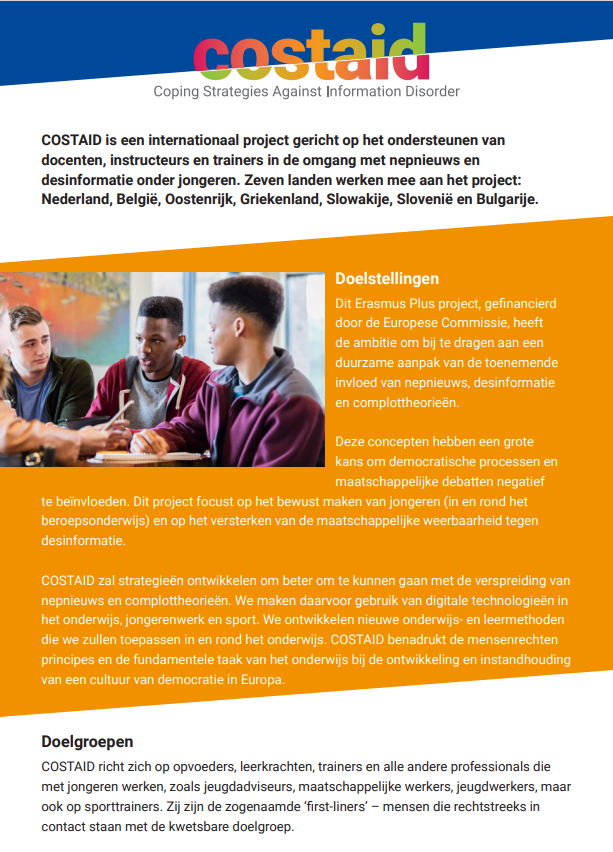 De invloed van desinformatie en nepnieuws onder jongeren neemt toe. Hoe kunnen we dit tegengaan? Het Verwey-Jonker Instituut neemt deel aan het internationale project COSTAID, dat zich richt op het ondersteunen van docenten, instructeurs en trainers in het omgaan met desinformatie en nepnieuws onder jongeren.