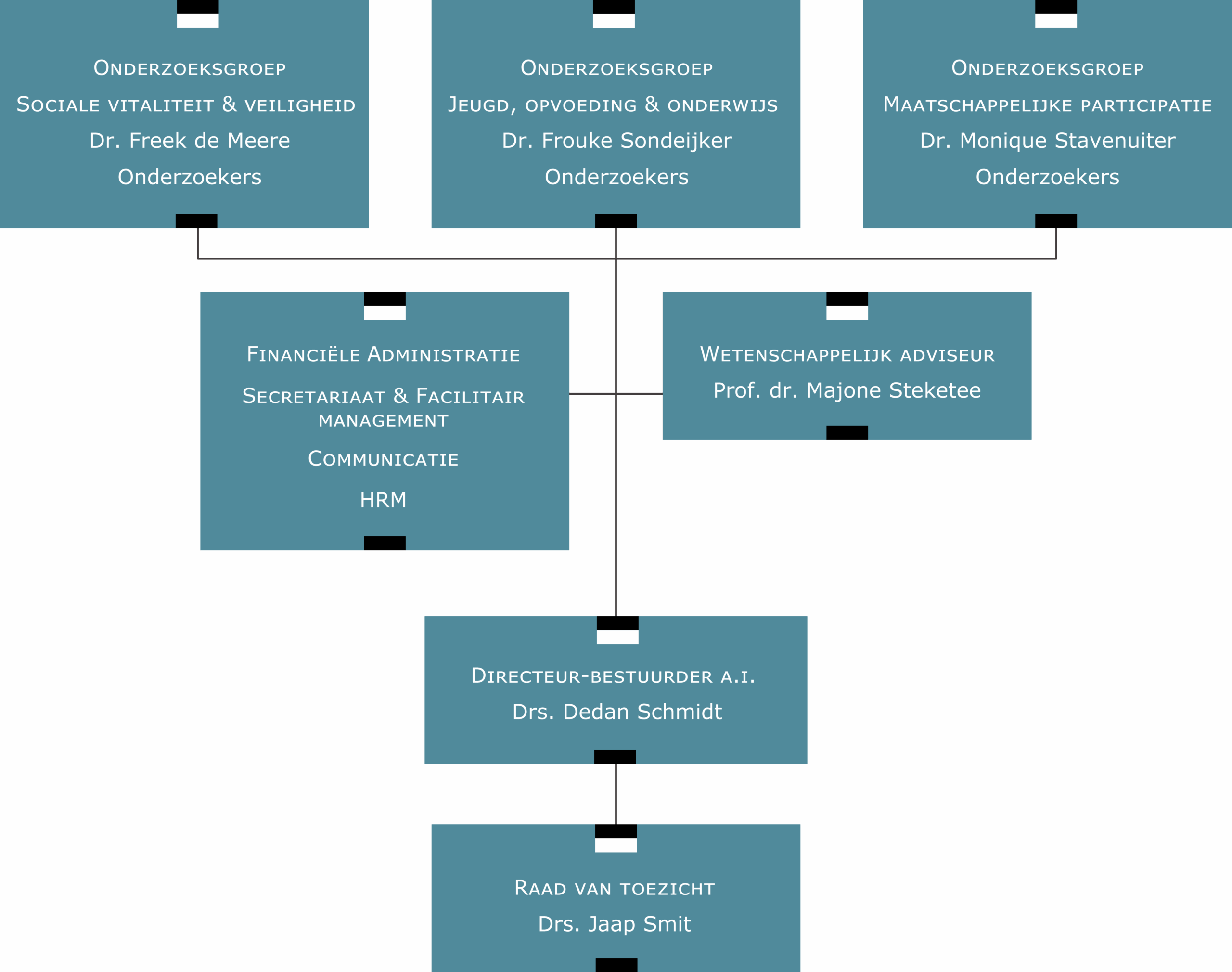 De raad van bestuur van het Verwey-Jonker Instituut bestaat uit drs. Dedan Schmidt. De raad van toezicht bestaat uit Jaap Smit (voorzitter), Monique Kremer, Lieke Sievers, Marjolein ten Hoonte, Monaïm Benrida en Bert Ferwerda.